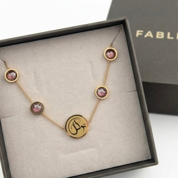 It is a very beautiful necklace, my only reservation is that the choker sometimes flips, hiding the beautiful calligraphy or the stones.